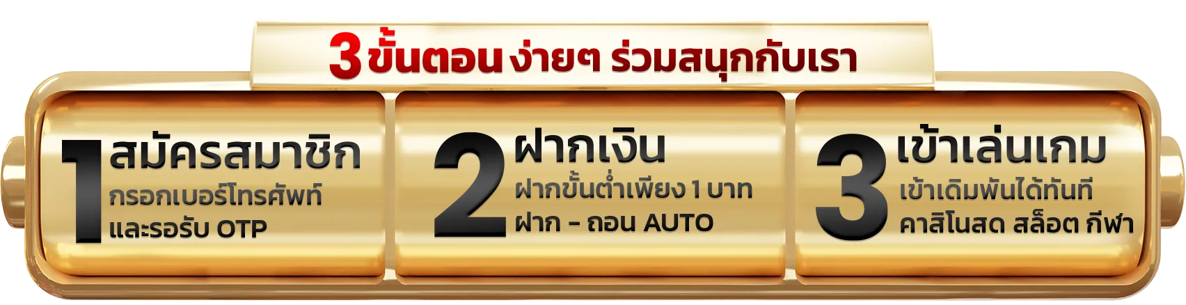 ตอบ : - กรอกข้อมูลผ่านหน้าเว็บไซต์ - ระบุเบอร์โทรศัพท์และบัญชีธนาคาร - ยืนยันตัวตนผ่าน OTP - เริ่มเล่นได้ทันทีหลังฝากเงิน